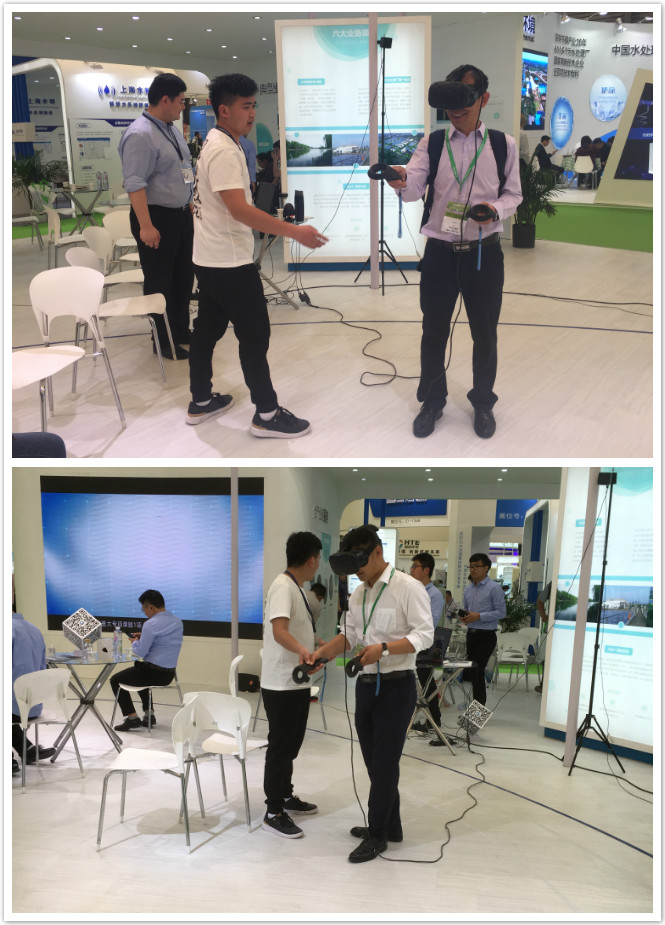 国祯环保管网事业部别出心裁,在展台中部为观众准备了一场VR盛宴。通过佩戴VR眼镜、操作智能手柄,大家可以“深入地下”,身临其境地体验到管网下井作业的规范流程,引得观众驻足体验,乐在其中。